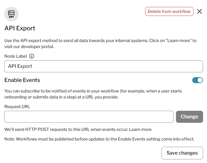 Configuring the Export API step within the Workflow Studio builder is essential to ensure that your system can receive and handle events correctly. This includes defining the Request URL, and enabling the events subscription.